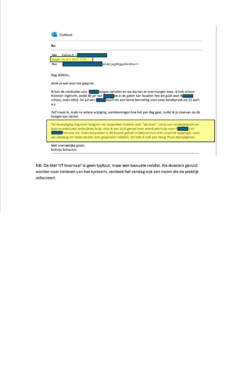 Uit een journaalpost van Veilig Thuis Drenthe — KPJ-er van GGZ Drenthe /Espria aan VT backoffice: